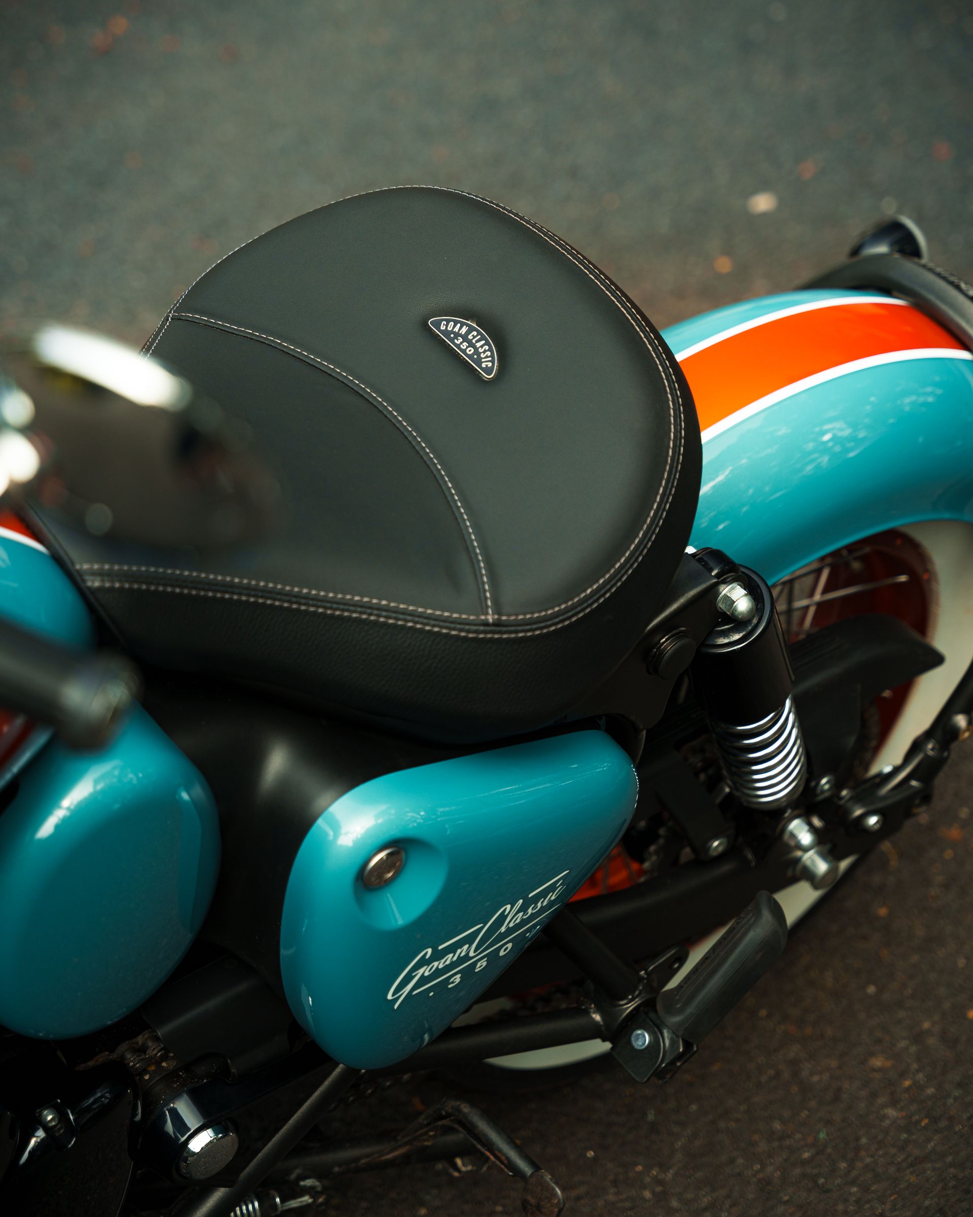 Goan Classic 350 vine echipat cu jante din aluminiu spițate și anvelope tubeless cu flanc alb. Roata față de 19” și cea spate, mai mică, dar mai lată, de 16”, dau motocicletei o siluetă întinsă și joasă, subliniind stilul bobber.